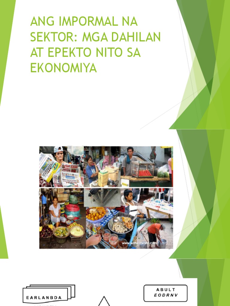1 Ito ang pangunahing dahilan kung bakit nakikilahok ang mga mamamayan sa impormal na sektor. Sa kabilang banda ang salitang impormal ay tumutukoy sa isang bagay na hindi. Hindi nakikita ang tunay na sukat at kalagayan ng ekonomiya ng bansa.