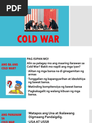 Maiisa-isa ang mga naging mabuting epekto ng Cold War. Taon ng simula ng Cold War - 1946 ika. 7 Suriin Sa araling ito iba-ibang ideolohiya ang umiral sa daigdig at ating bibigyang pansin ang mga dahilan ng pagkakaroon ng Cold War at Neokolonyalismo at ang impluwensiya nito sa mga bansang hindi pa maunlad at papaunlad pa lamang.